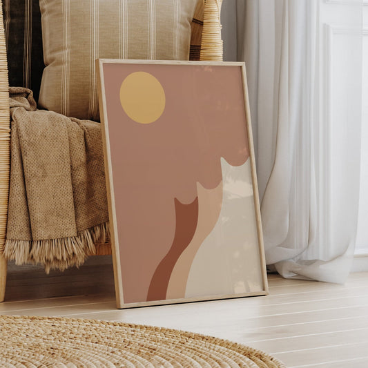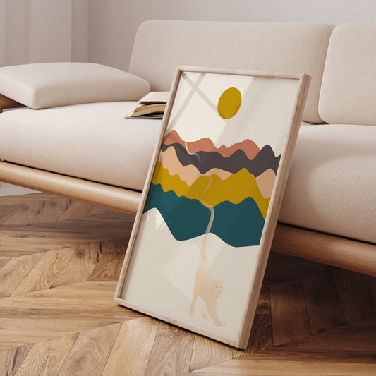 川と日の出、そして猫がいる風景ポスター