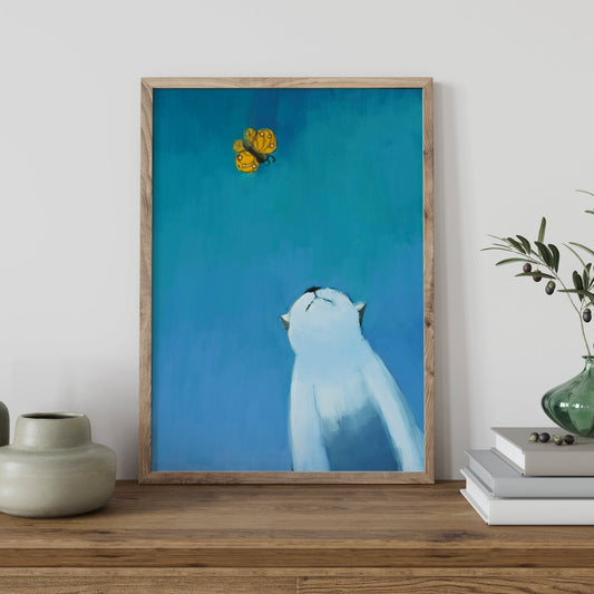 蝶を見つめる猫の絵画風ポスター